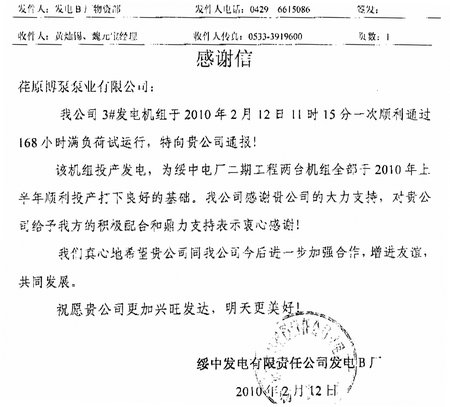 日前,綏中發(fā)電有限責(zé)任公司發(fā)電B廠發(fā)來感謝信,通報了我公司供貨的2000VZNM型立式循環(huán)水泵順利通過168小時滿負(fù)荷試運行, 順利發(fā)電。綏中發(fā)電有限責(zé)任公司發(fā)電B廠,為2X1000MW超